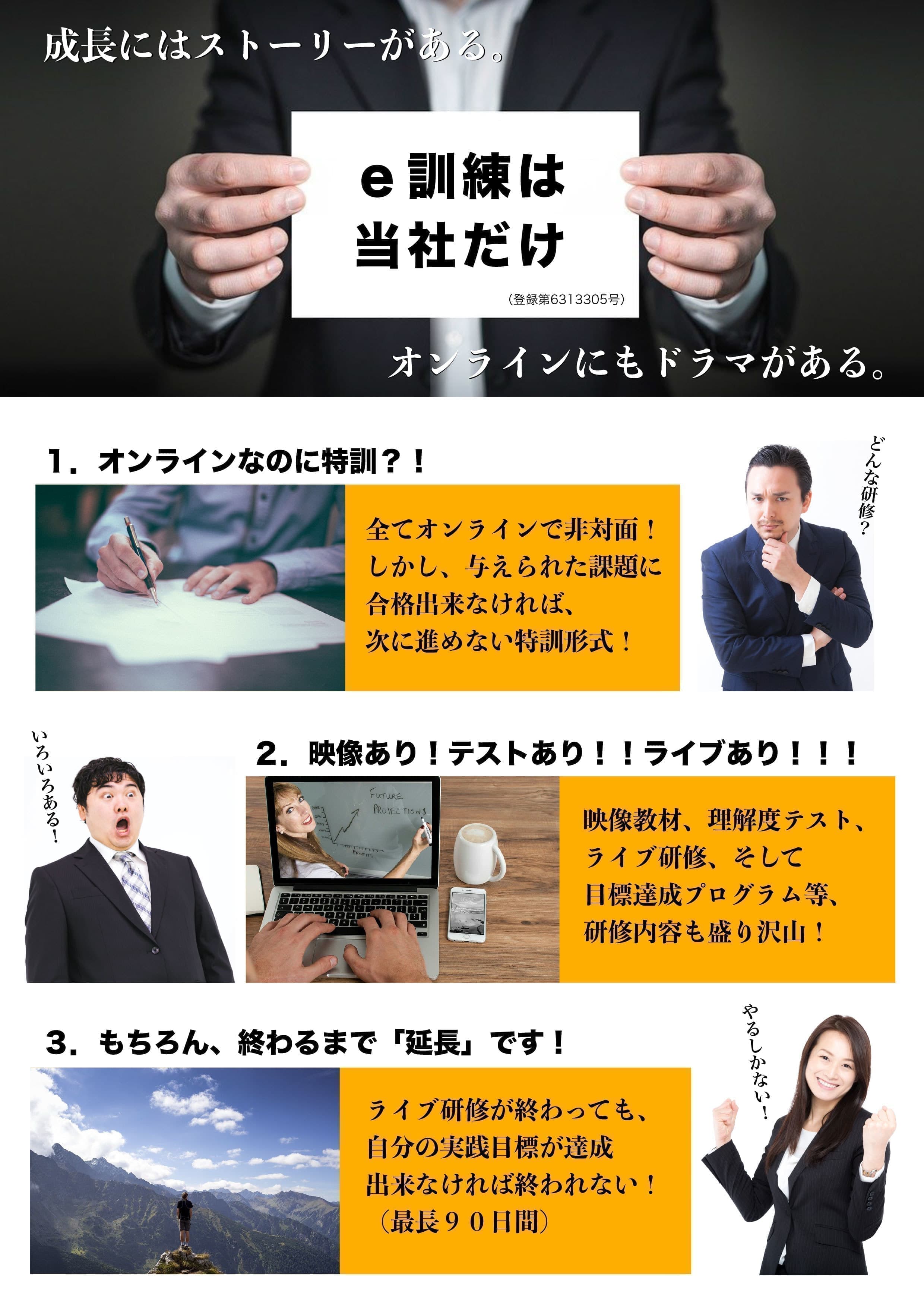 e訓練ビジネス基礎コースは、全てがオンラインで完結するため、移動が無くスケジュールに組み込みやすい事、不特定多数との接触が無いため、新型コロナウイルスへの感染の心配が無いことがメリットです。基本動作は動画で学ぶため、分からないところは期間中なら繰り返し確認することができます。また、行動目標を達成するまで最長90日間フォローをする点が合宿とは異なります。まとまった時間は取れないけれど研修を実施したい企業や、オンラインでも研修効果を上げたい企業にお勧めします。