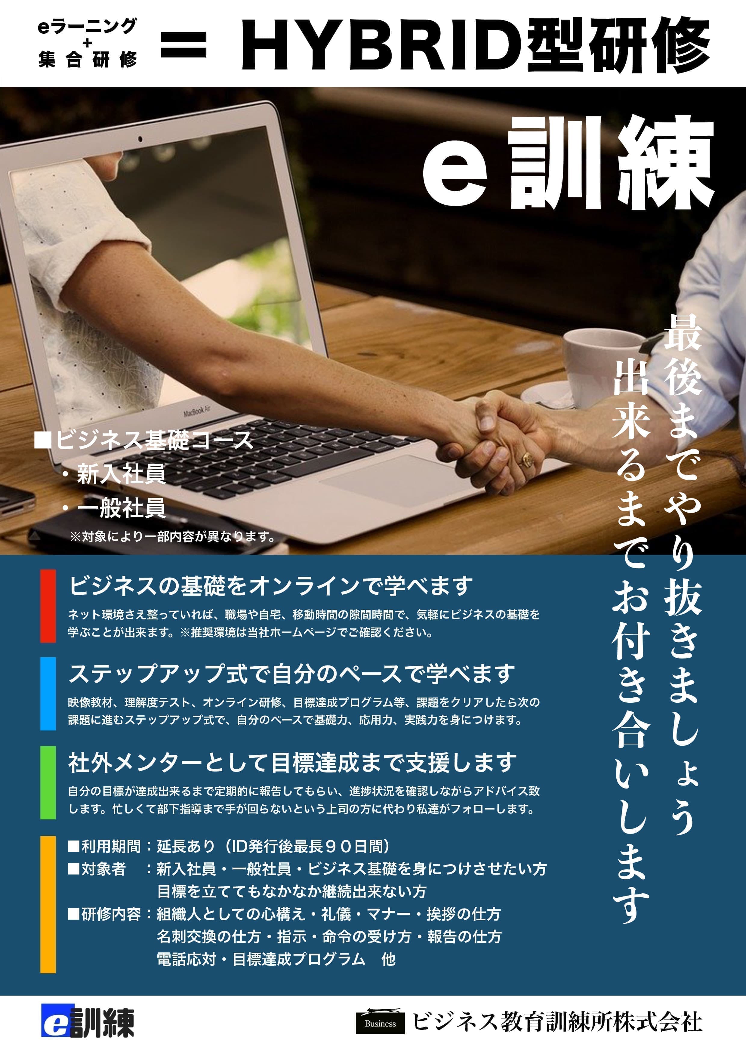 | 研修内容 | 組織人としての心構え・礼儀・マナー・挨拶の仕方 名刺交換の仕方・指示・命令の受け方・報告の仕方 電話応対・目標達成プログラム 他 |